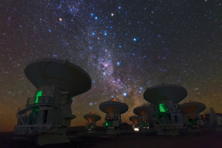智利沙漠上的 ALMA 望遠鏡,運用了「天文干涉技術」,一共有 66 座天線可以協同工作,且天線之間距離夠遠,才得以拍出原行星盤的細緻結構。在此以前,前一代望遠鏡對於這些年輕的原行星盤,只能看見平滑的盤面,沒有明顯的起伏,直到 ALMA 啟用才有重大突破。
