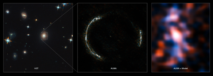 此外,愛因斯坦環還能推知背景星系的影像。背景星系遙遠而黯淡,但經過透鏡星系有放大的效果,運用電腦計算可還原出極高解析度的影像。