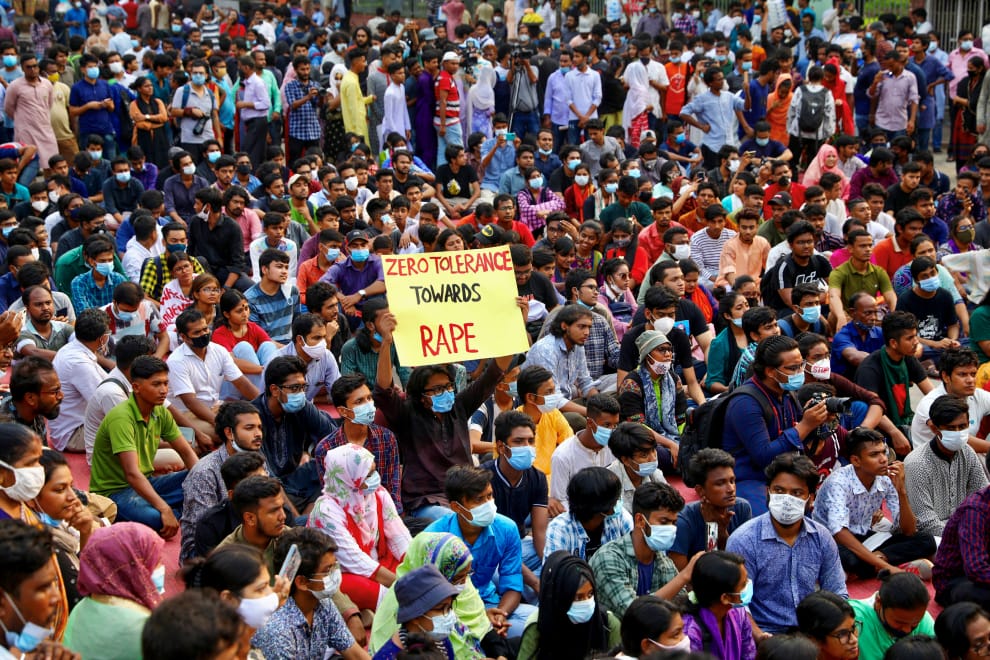 在首都達卡周圍的諾阿卡利市(Noakhali),大批民眾上街替輪暴案受害者發聲,其中一人手舉寫有「對強暴零容忍」字樣的海報抗議。