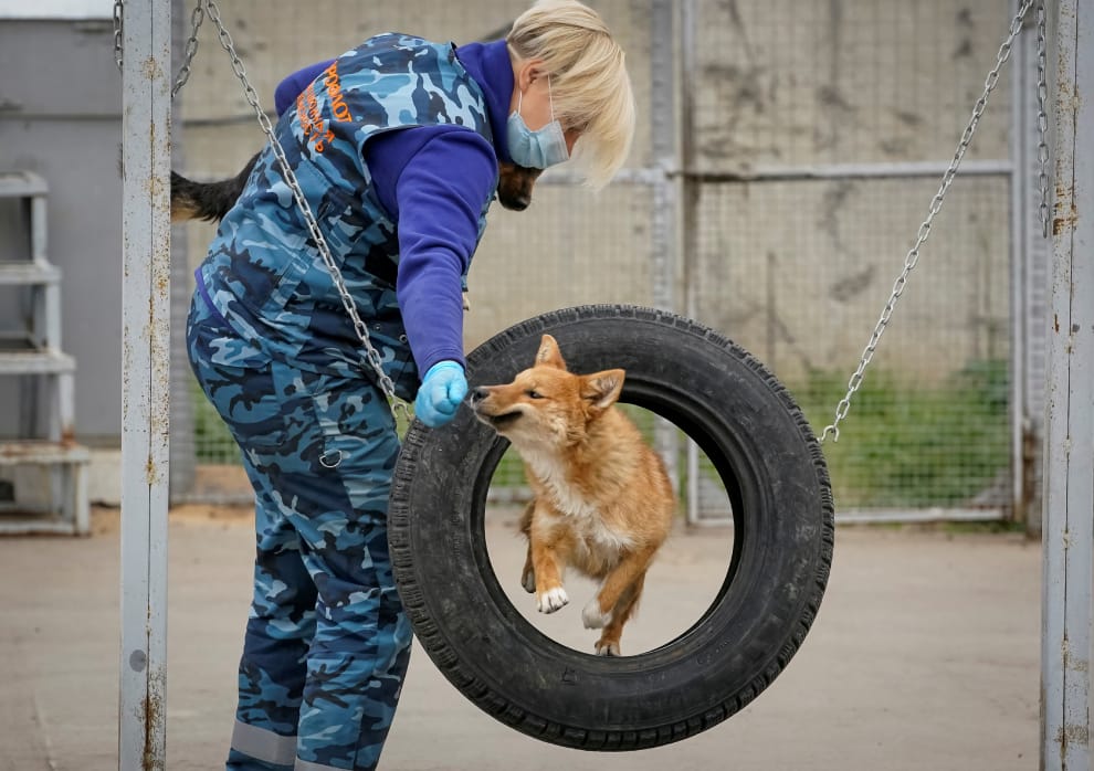 在莫斯科的謝列梅捷沃國際機場(Sheremetyevo international airport),工作人員正在訓練能聞出COVID-19(武漢肺炎)患者的檢疫犬。