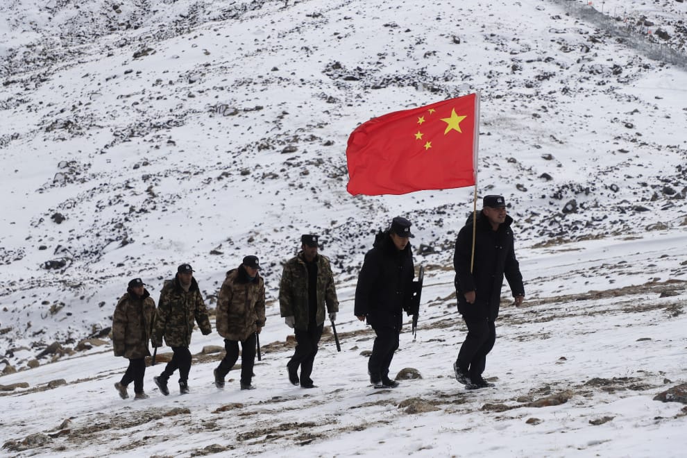 在新疆維吾爾自治區的塔什庫爾干塔吉克自治縣,一隊邊境警察手拿中國國旗巡邏。