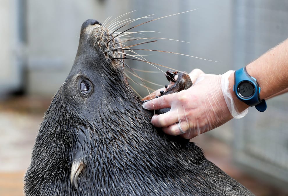 在布拉格動物園內,工作人員正在為海獅作牙齒檢查。