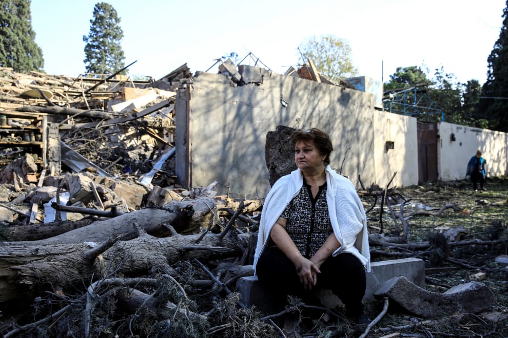 在亞塞拜然與亞美尼亞的爭議領土納戈爾諾-卡拉巴赫地區(Nagorno-Karabakh)的占賈(Ganja),一顆飛彈意外落在住宅區中,導致數座建築崩塌。天亮後,這名婦女坐在爆炸現場附近,看著救難隊搜尋事故現場,希望自己的親友能成為獲救一員。