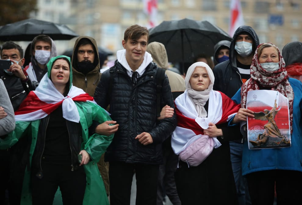 在白羅斯首都明斯克,反政府群眾再度走上街頭,表達對現任總統盧卡申科(Alexander Lukashenko)於今年 8月的總統大選中作票讓自己順利勝選的不滿。