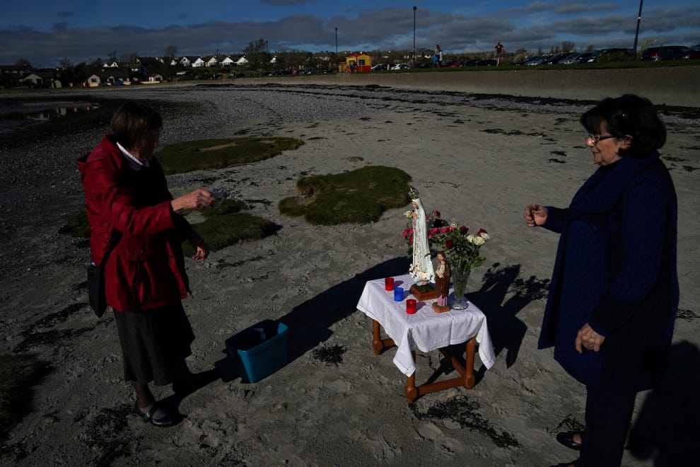 在愛爾蘭鄰大西洋畔的高威市(Galway)的貝利拉根海灘上(Ballyloughane beach),諾頓(Christine Naughton,紅衣者)在參加一場全國性的祈禱會、感謝上蒼在COVID-19(武漢肺炎)疫情期間的種種保護前,用聖水祝福一尊聖母瑪利亞的雕像。