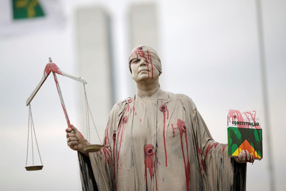 在巴西首都巴西利亞,一名示威者手持憲法、畫上特殊裝扮,走上街頭參與反對巴西總統波梭奈羅(Jair Bolsonaro)施政,以及巴西國內種族主義的遊行。