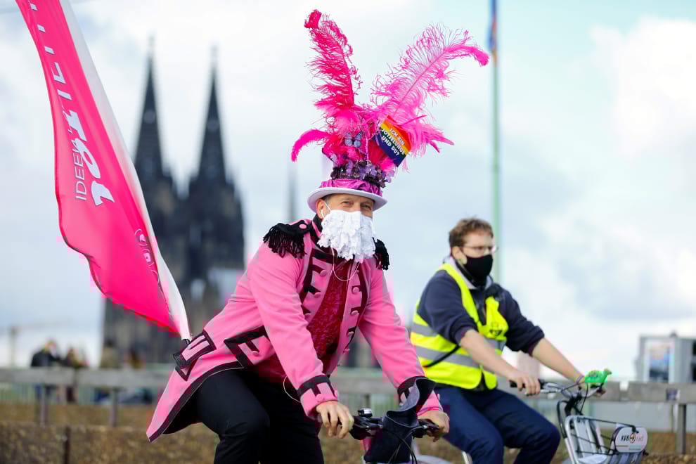 在德國大城科隆(Cologne),一名男子穿上粉紅色的華麗服裝,騎著腳踏車出門參與一年一度的克里斯多福大街紀念日(Christopher Street Day)。每年,歐洲各大城市的LGBT社群都會在各自的城市舉辦慶祝活動和遊行,響應這項一年一度的大型慶典。