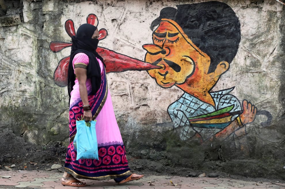 在印度大城孟買,一名婦女經過街邊的一幅塗鴉。