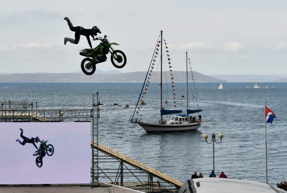 在俄國東部大城海參崴(Vladivostok)舉辦的機車暨水上運動節「海參崴-2020」(Vladivostok-2020)上,一名表演者騎機車衝上跳台,在空中表演特技。