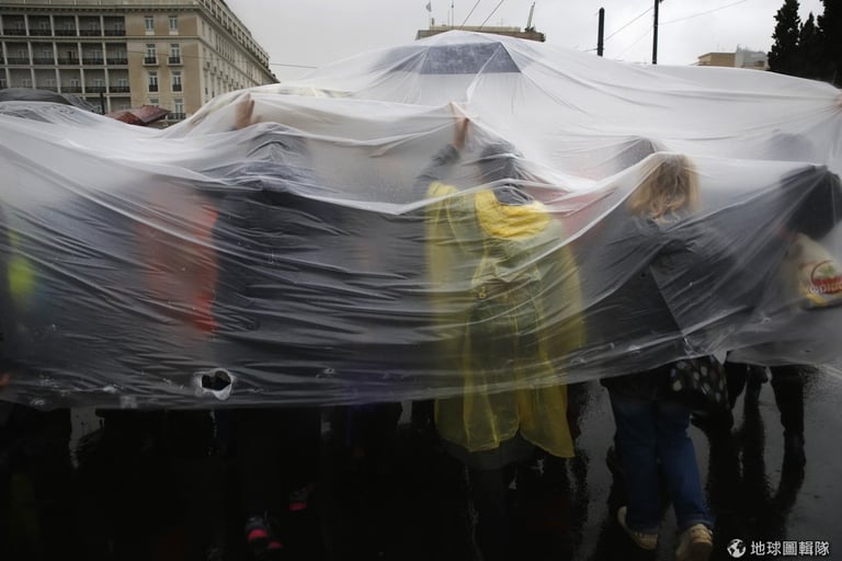 沒了工作的公立學校警衛們拿起塑膠布擋住大雨,他們正在示威抗議政府的撙節政策,這場長達24小時的大規模罷工是由希臘公私立部門聯合發動,他們趁歐盟議會、歐洲央行、以及國際貨幣組織派員訪查時,表達對撙節政策的不滿