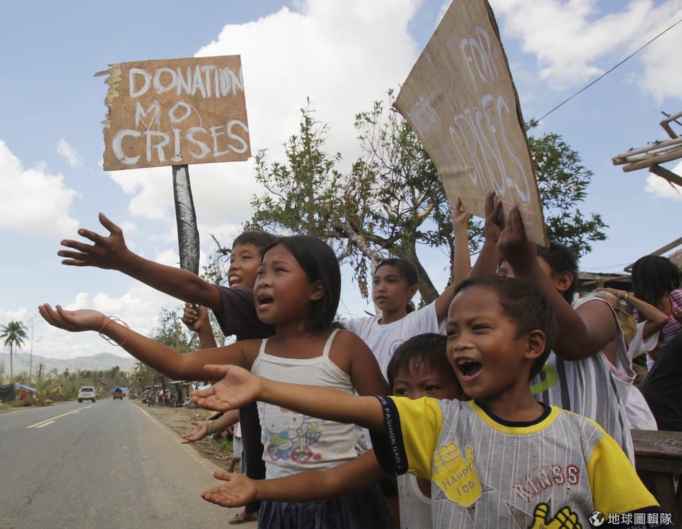 許多寶發颱風受災的孩童們在街上拿著標語求助物資和食物