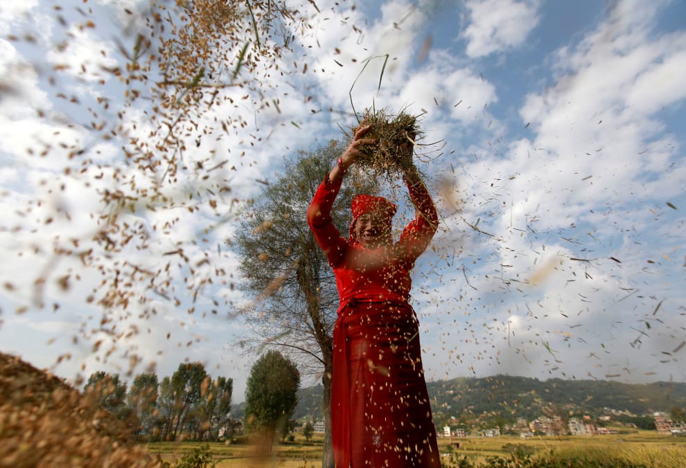 在尼泊爾城鎮巴克塔普爾(Bhaktapur),每年的 10月16日是世界糧食日(World Food Day),一名農夫在自家的田裡收割稻穀。