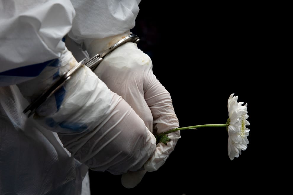 在菲律賓首都馬尼拉的馬尼拉北部公墓(Manila North Cemetery),服刑中的菲律賓人權工作者納西諾(Reina Mae Nasino)拿著一朵花,悼念年僅 3個月大的女兒。