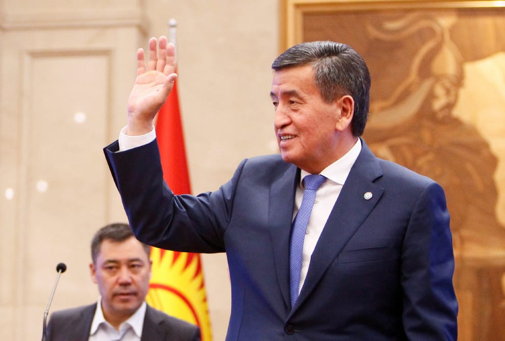 在吉爾吉斯首都比斯凱克(Bishkek)一場國會舉辦的特別會議上,前總統熱恩別科夫(Sooronbai Jeenbekov,右)向附近的人揮手致意,在他身後則是現任吉爾吉斯總理扎帕羅夫(Sadyr Japarov)。