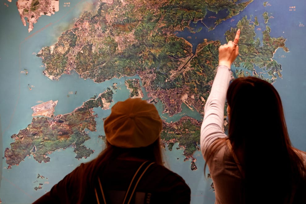 在香港的香港歷史博物館(Hong Kong Museum of History)中,兩名前來參觀「香港故事展」(The Hong Kong Story)的遊客正在仔細研究牆上的一張香港地圖。