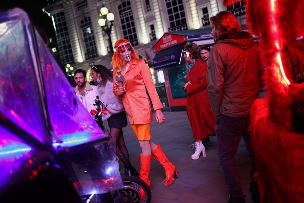 在英國首都倫敦酒吧林立的蘇活區(Soho district),一名戴著面罩的路人從前來蘇活區放鬆的顧客們當中走過。