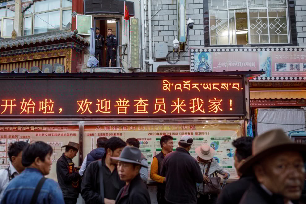 在中國西藏自治區拉薩(Lhasa)的大昭寺(Jokhang Temple)附近,兩名警察從LED看板後的建築中監視著市集。