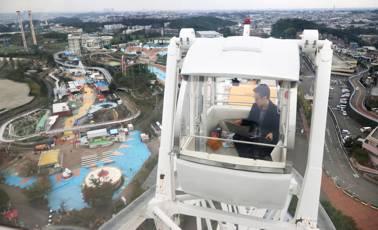 當山元辰樹在摩天輪上跟同事開視訊會議時,他還透過筆電鏡頭把高空美景展示給其他人看,並打趣地說:「你在空中真的很難專心,畢竟會不知道該看風景還是該工作。」