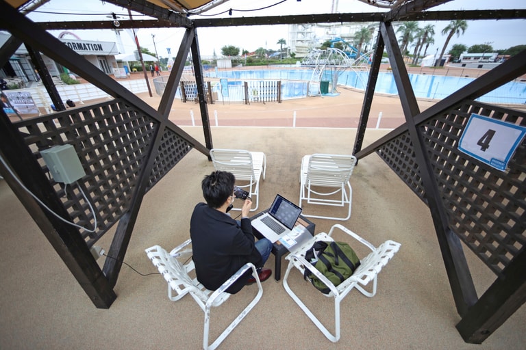 根據讀賣樂園官網的介紹,這個「主題辦公樂園」平日一人 1,900日幣(折台幣約 519元),周末或國定假日則為一人 2,000日幣(折台幣約 546元),園方開放工作的地點為早上 9點到下午 4點的游泳池邊。在這裡,每個人都被安排了兩張海灘椅、兩張座椅,以及一張桌子,Wi-Fi、充電設備也一應俱全。