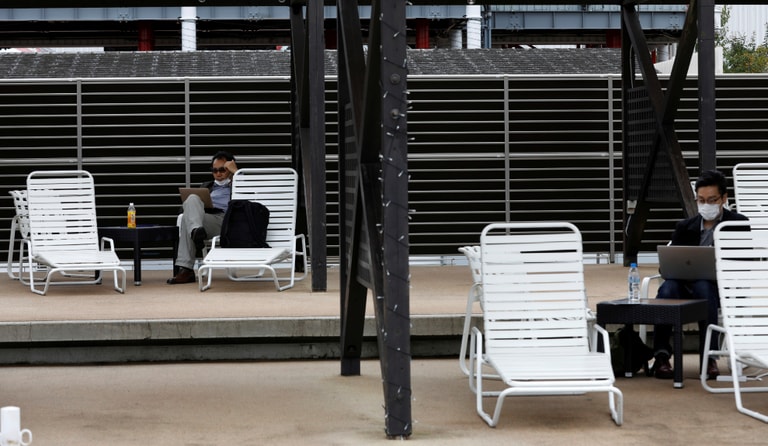 鏡頭來到讀賣樂園推出「主題辦公樂園」的第一天,當時大約有 10個人前來這裡工作,今年 47歲、科技公司FLEQ的社長山元辰樹(Tatsuki Yamamoto,音譯)就說:「我蠻愛在戶外工作的,這樣感覺很好。這個計畫真的挺不賴。」