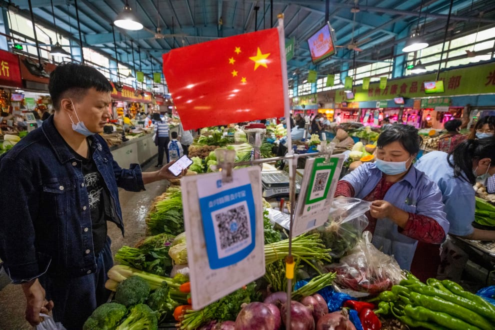 在中國杭州一間傳統市場內,消費者可以用掃QR code的方式消費。