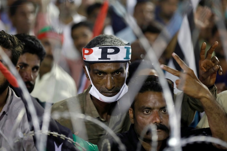 在巴基斯坦臨阿拉伯海的城市喀拉蚩(Karachi),在野黨組成的政治聯盟巴基斯坦民主運動(Pakistan Democratic Movement),發起一場反政府的示威遊行活動,一名巴基斯坦人民黨(Pakistan Peoples Party,PPP)的支持者圍上頭巾,與其他示威者一起在台下聆聽台上的演講。