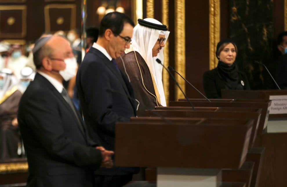 在巴林首都麥納瑪(Manama),在以色列、巴林兩國正式簽署建交公報後,以色列代表團的領導人國安顧問沙巴特(Meir Ben Shabbat,左)、居中負責牽線的美國代表團領導人財政部長梅努欽(Steven Mnuchin,中)和巴林官員(右),一同對外發布消息。