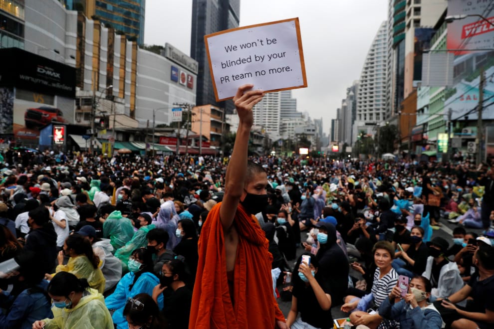 在泰國首都曼谷一場反政府示威中,一名身著橘色僧袍的泰國和尚走入示威群眾當中,高舉寫有「我們不會再被你的公關團隊矇騙」字樣的海報與群眾站在一塊。