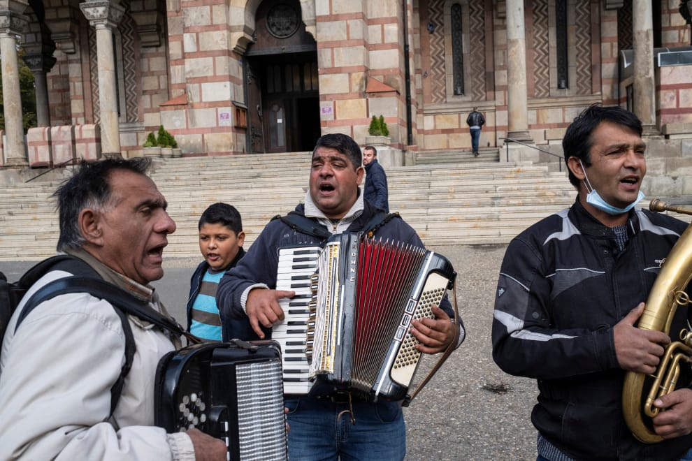 在塞爾維亞首都貝爾格萊德(Belgrade)的聖馬可教堂(St. Marko's Church)前,街頭音樂家聚在一起演奏音樂。