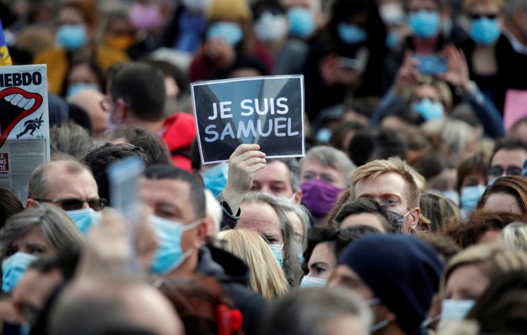 在巴黎共和國廣場(Place de la Republique),成千上萬人一塊悼念遭人當街斬首的歷史老師帕蒂(Samuel Paty)。在人群中,一位民眾舉起「#我是山謬」(#JeSuisSamuel)字樣的海報,山謬是帕蒂老師的名字,藉此呼籲眾人團結對抗恐怖主義。