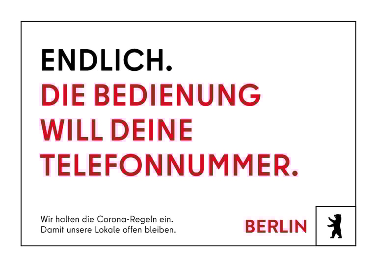 這則廣告以柏林市最新的防疫措施為素材,現在進到柏林的餐廳中用餐,服務生都會簡單蒐集顧客們的聯絡資料,以便未來傳出有人確診時,政府當局可以快速跟進追蹤。