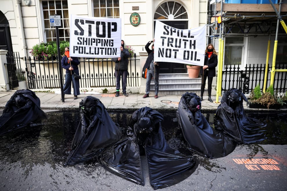 在英國首都倫敦,環保團體海洋反叛(Ocean Rebellion)的示威者在國際海事組織(International Maritime Organisation)的氣候會議召開第一天,跑到巴拿馬大使館外抗議。在左後方,兩名示威者舉著「終結運送汙染」的標語;右後方示威者的標語則寫著:「提供真相,而非油汙」。