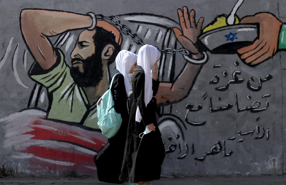 在加薩走廊,兩名學生走過一幅壁畫,這幅壁畫描繪了被以色列監禁、絕食抗議中的巴勒斯坦男子阿赫拉斯(Maher Al-Akhras)。