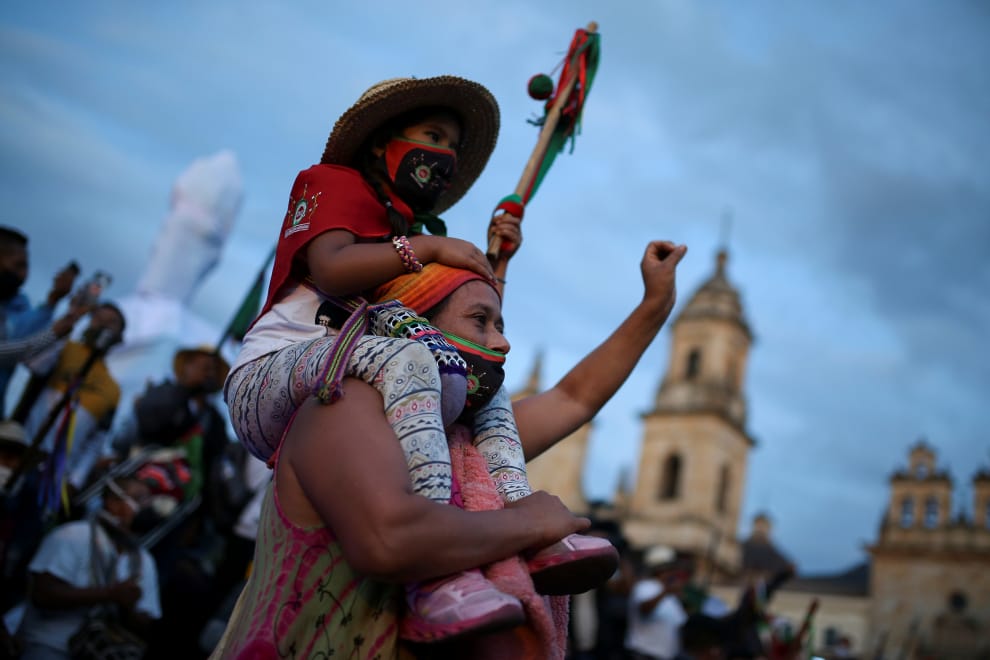 在哥倫比亞首都波哥大(Bogota)原住民們舉辦的傳統集會「明加」(Minga)上,哥倫比亞原住民們一同發動示威,抗議政府當初與哥倫比亞革命軍(FARC)簽訂的和平協議實施狀況不佳、原住民的領袖仍然在自家傳統領地上被非法武裝團體殺害等事件。