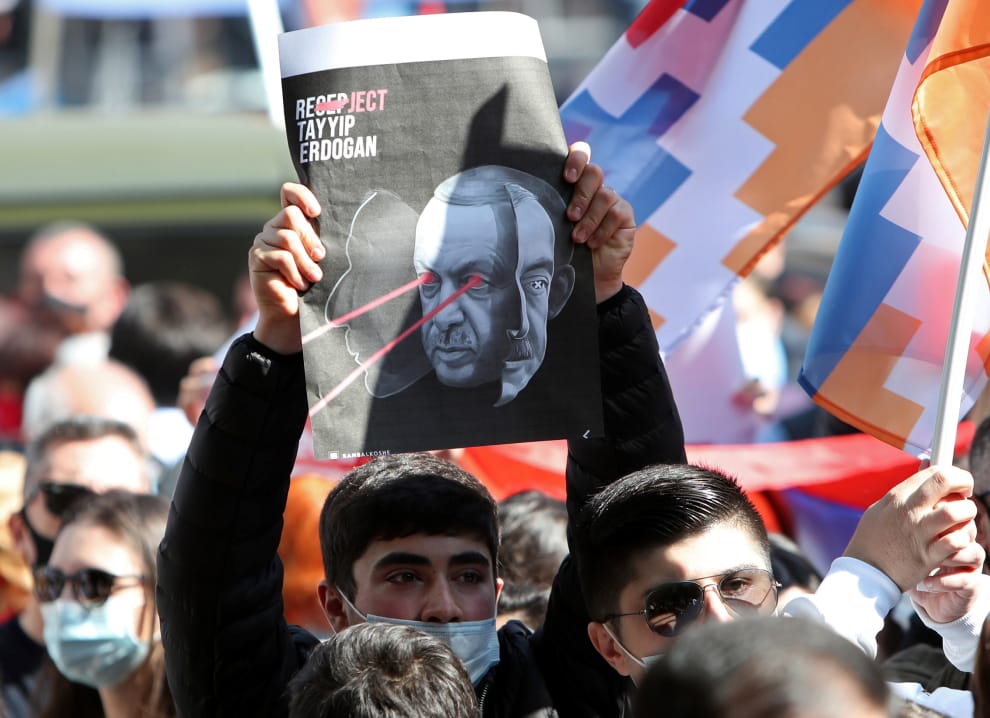 在亞美尼亞首都葉里溫(Yerevan)的聯合國辦公室外,示威者高舉一張土耳其總統埃爾多安(Tayyip Erdogan)雙眼放出雷射光的海報,抗議國際社會漠視埃爾多安派兵軍援亞塞拜然、干預兩國戰事一舉。
