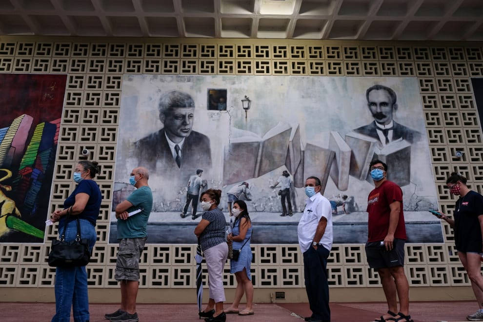 在美國佛羅里達州邁阿密附近的海厄利亞市(Hialeah),選民在當地的甘迺迪圖書館投票站前排隊,準備入內投票。
