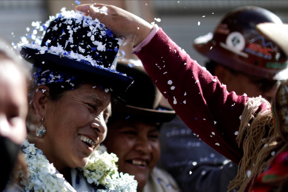 在玻利維亞西部埃爾阿爾托(El Alto),玻利維亞總統大選開跑後隔天,「爭取社會主義運動-爭取人民主權政治機構(Movement to Socialism,MAS)」政黨的副主席康多里(Hilda Condori)在一場集會上露出微笑。