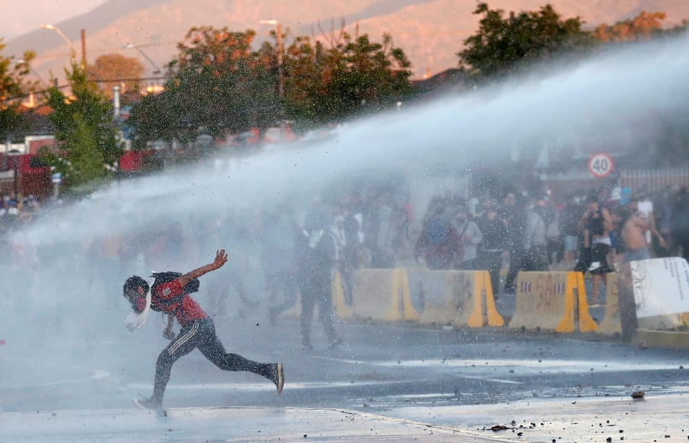 在智利中部靠海的小鎮基爾普埃(Quilpue),一名示威者快步從警方水砲車的噴射範圍中逃離。