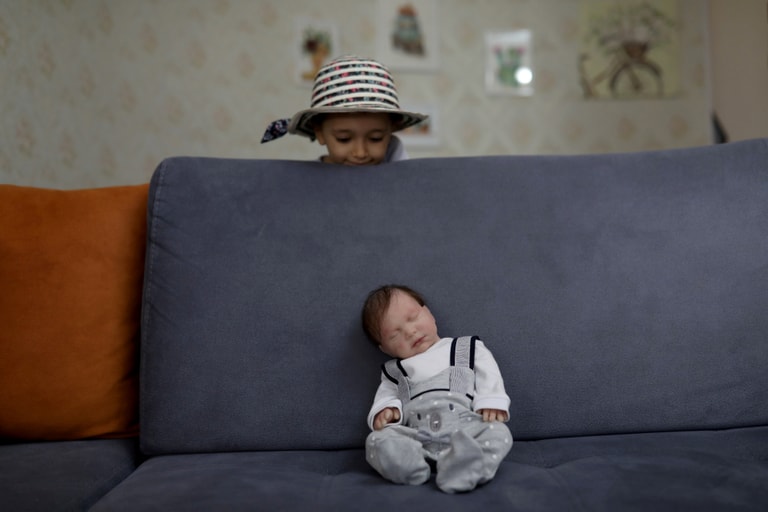 在伊朗首都德黑蘭(Tehran),巴蘭(Baran)從一張沙發後探出頭來,看著以她小時候模樣為造型製作出的仿真娃娃(reborn baby doll)。