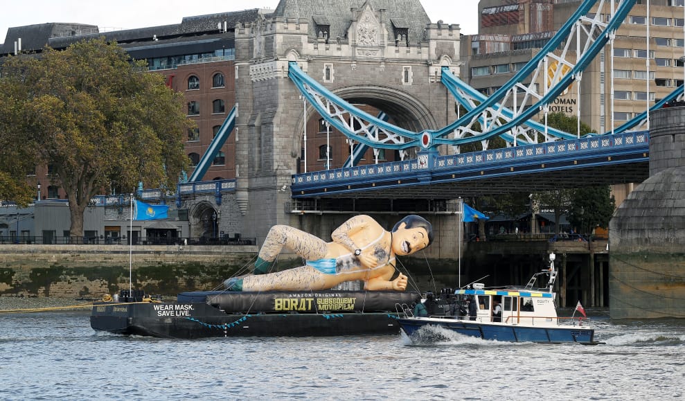 在英國首都倫敦,一艘船載著喜劇芭樂特 2(Borat Subsequent Moviefilm)主角芭樂特(Borat)的充氣模型,沿著泰晤士河航行,宣傳這部即將上映的喜劇。