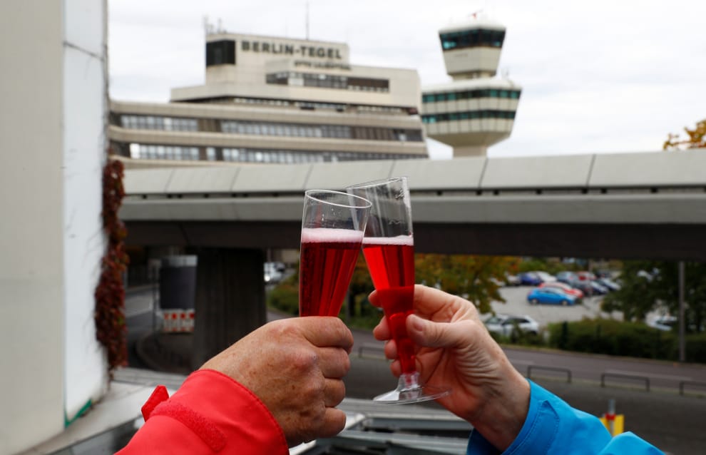 在德國首都柏林,沃克納(Marlies Voelkner,左)和諾瓦奇(Anette Nowacki,右)特地在柏林-泰格爾奧托·利林塔爾機場(Berlin-Tegel Airport)永久關閉前來拜訪它,向這座機場告別。