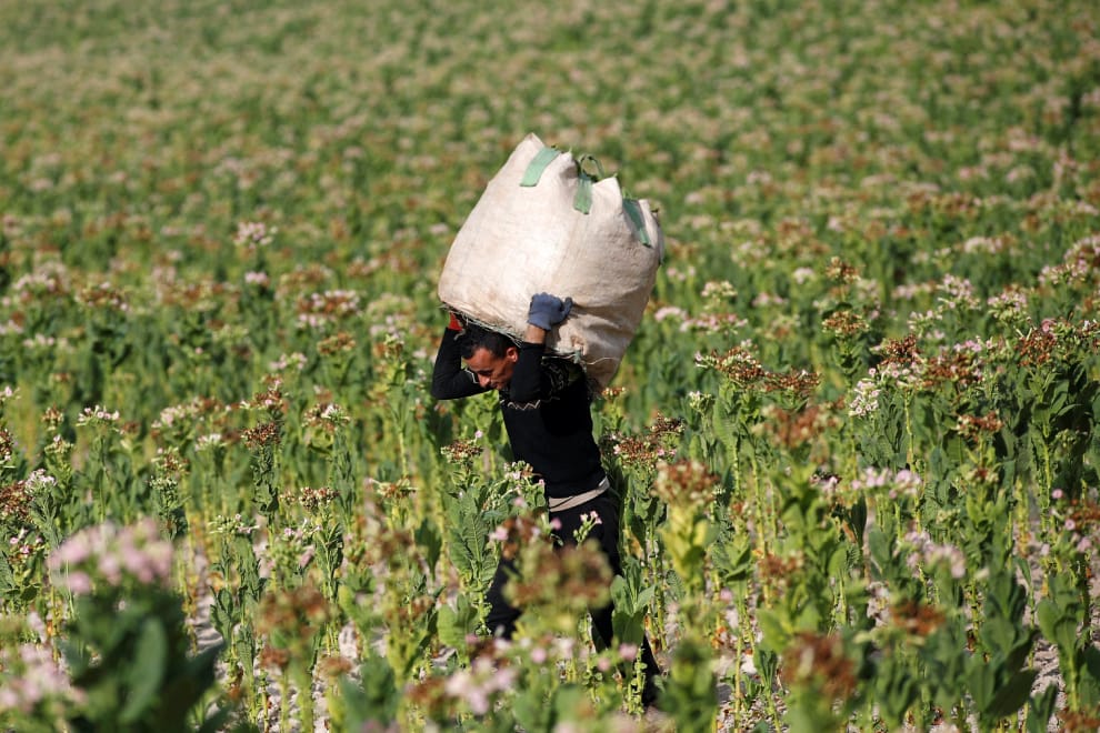 在巴勒斯坦北部城市傑寧(Jenin)附近的一塊田地中,一名工人揹著剛採收的菸草,準備拿到當地市場上販賣。