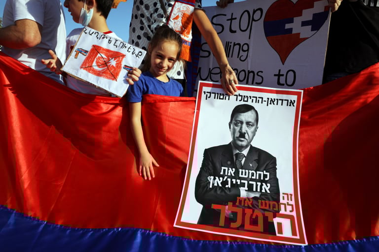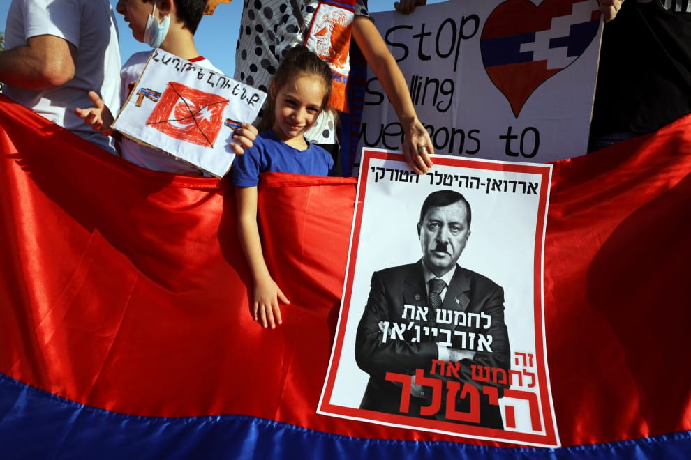 在耶路撒冷的以色列外交部外,亞美尼亞社群的人和其他以色列示威者一起來到外交部外,抗議以色列政府打算在亞塞拜然、亞美尼亞開戰之際,出售軍武給亞塞拜然。