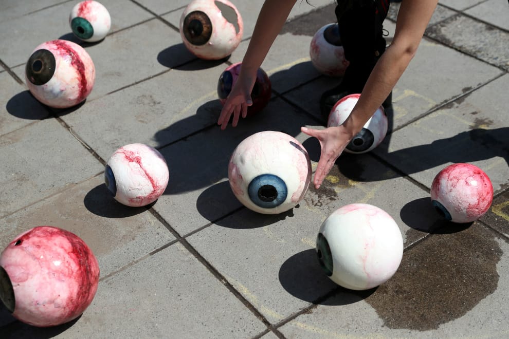 在智利首都聖地牙哥(Santiago)的一場反政府示威中,一名示威者在地上擺滿眼珠模型,紀念在 2019年的反政府示威過程中眼睛受傷的民眾。