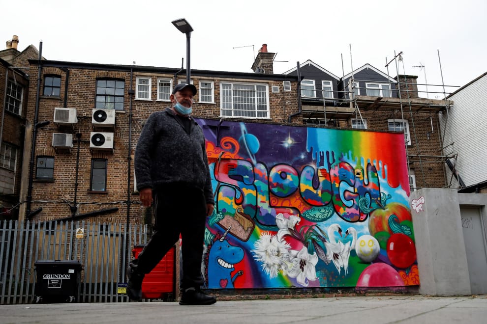 在英國南部的小鎮史勞(Slough),一名戴著口罩的男子經過一面藝術家彩繪的壁畫。