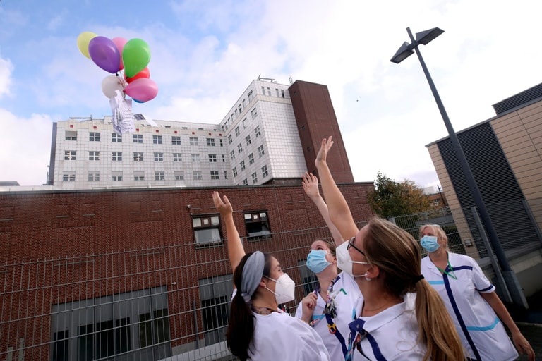 在比利時首都布魯塞爾的聖安妮-聖雷米診所(St Anne-St Remi Clinic),醫護人員們用一場快閃表演,向比利時政府的種種防疫措施表達抗議。表演結束後,醫護人員們一同施放氣球。