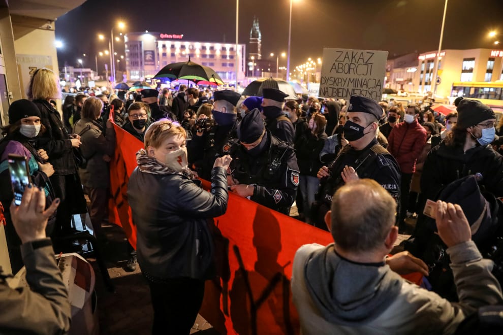 在波蘭首都華沙,支持女性享有墮胎權的民眾走上街頭,抗議大法官新公布的釋憲案。波蘭的墮胎法律原本就已經是全歐盟最嚴格,大法官的釋憲結果禁止婦女以「胎兒先天障礙」為由墮胎,進一步拉高波蘭女性在國內合法墮胎的難度。