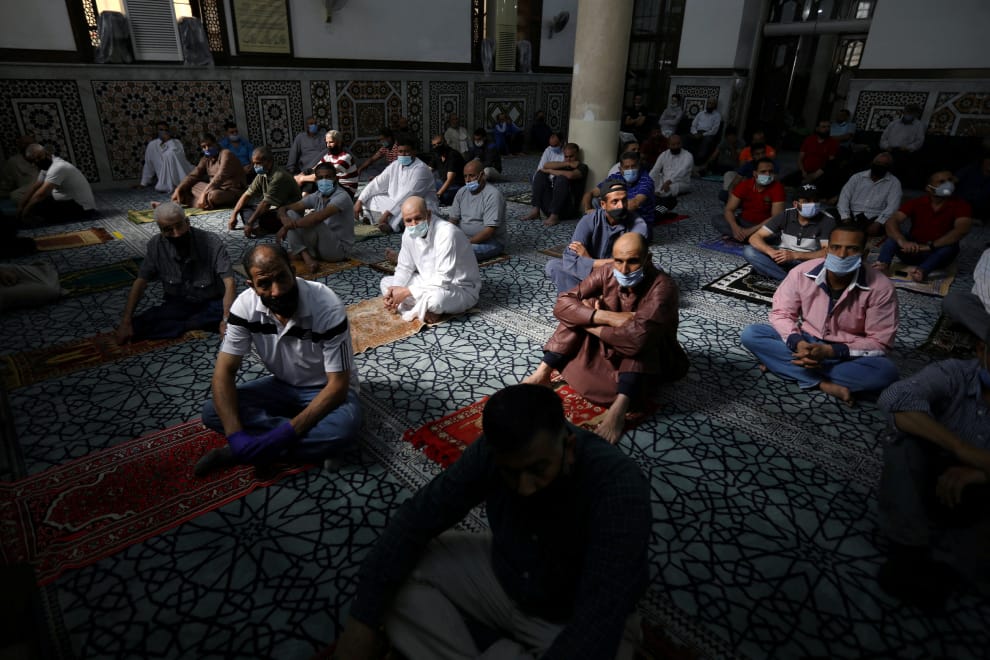 在約旦首都安曼(Amman),23號這天政府開放一個小時的時間,讓穆斯林們可以前往清真寺中參加禮拜。一群穆斯林們利用機會,一起到侯賽尼清真寺中(Husseini Mosque)參加周五的祈禱活動。
