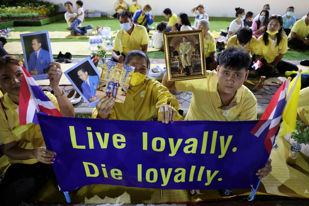 在泰國首都曼谷大皇宮(The Grand Palace)前,泰國王室的支持者們帶著「生為王室,死為王室」(Live loyally, Die loyally.)的標語站在街頭,等待泰王瓦吉拉隆功(Maha Vajiralongkorn)及王后蘇堤達(Suthida Tidjai)抵達現場。