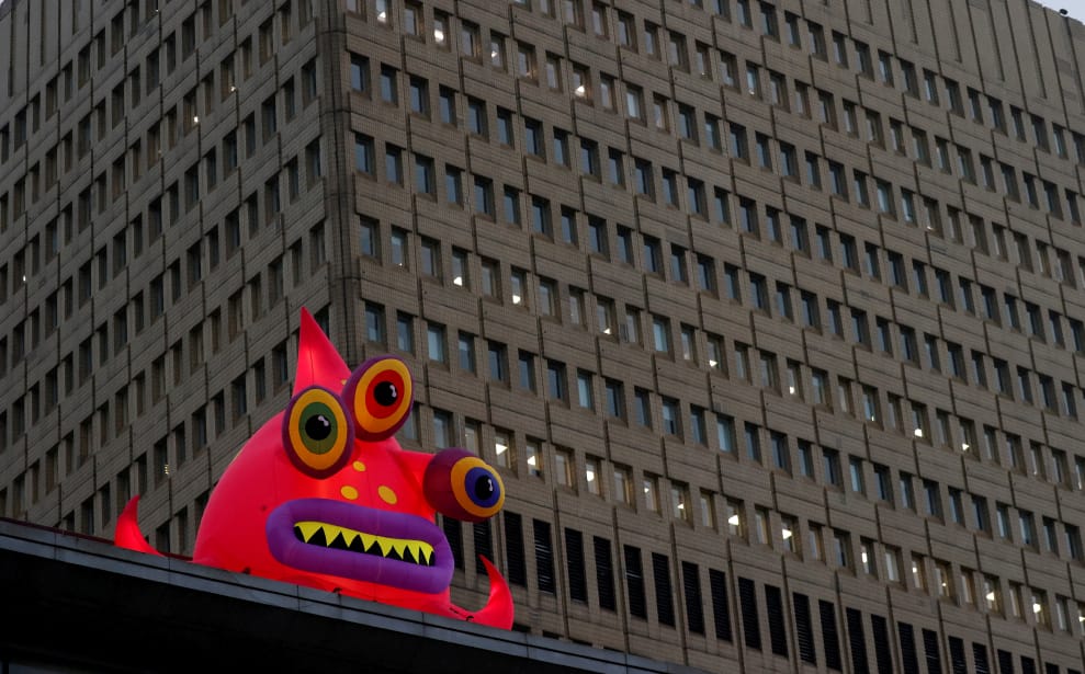 在工業大城曼徹斯特(Manchester),一隻巨型充氣怪物從辦公大樓前冒了出來,準備迎接萬聖節的到來。